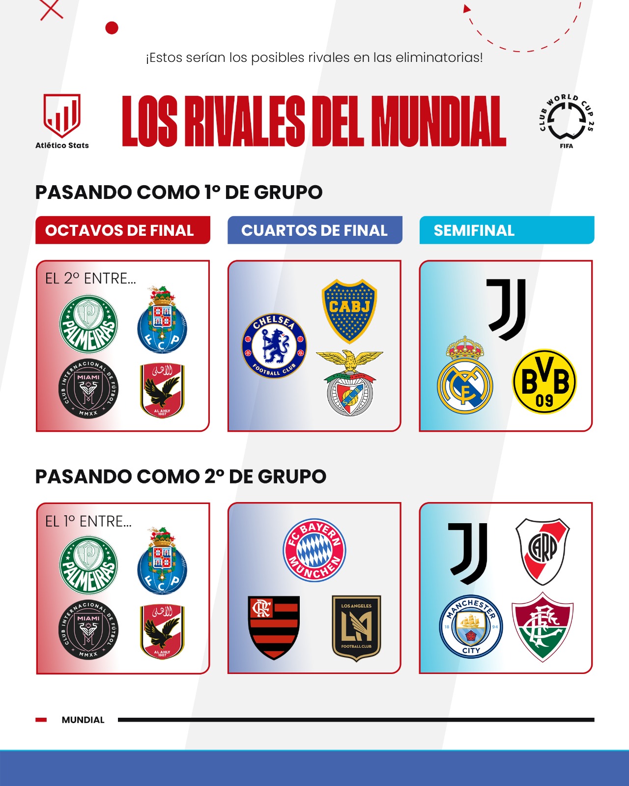 - Vamos a la opción de si quedamos primeros, la más 'remota': todo apuntaría a que el primero sería Palmeiras o Inter de Miami, el segundo del grupo A; en cuartos, Chelsea o Benfica y también la posibilidad de Boca Juniors (ojo ese Julián vs Boca); ya en semis, Real Madrid, Juventus o Borussia Dortmund; y en la final, pues todo sería o el PSG o Bayern.