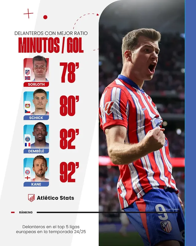 Llegaba Sorloth al Atleti tras la mejor temporada de su carrera en el Villarreal (26 goles y 6 asistencias). Se estrenó con gol en la primera jornada de Liga —19 de agosto—, pero hasta el 20 de octubre no volvió a ver puerta —doblete ante el Leganés—.