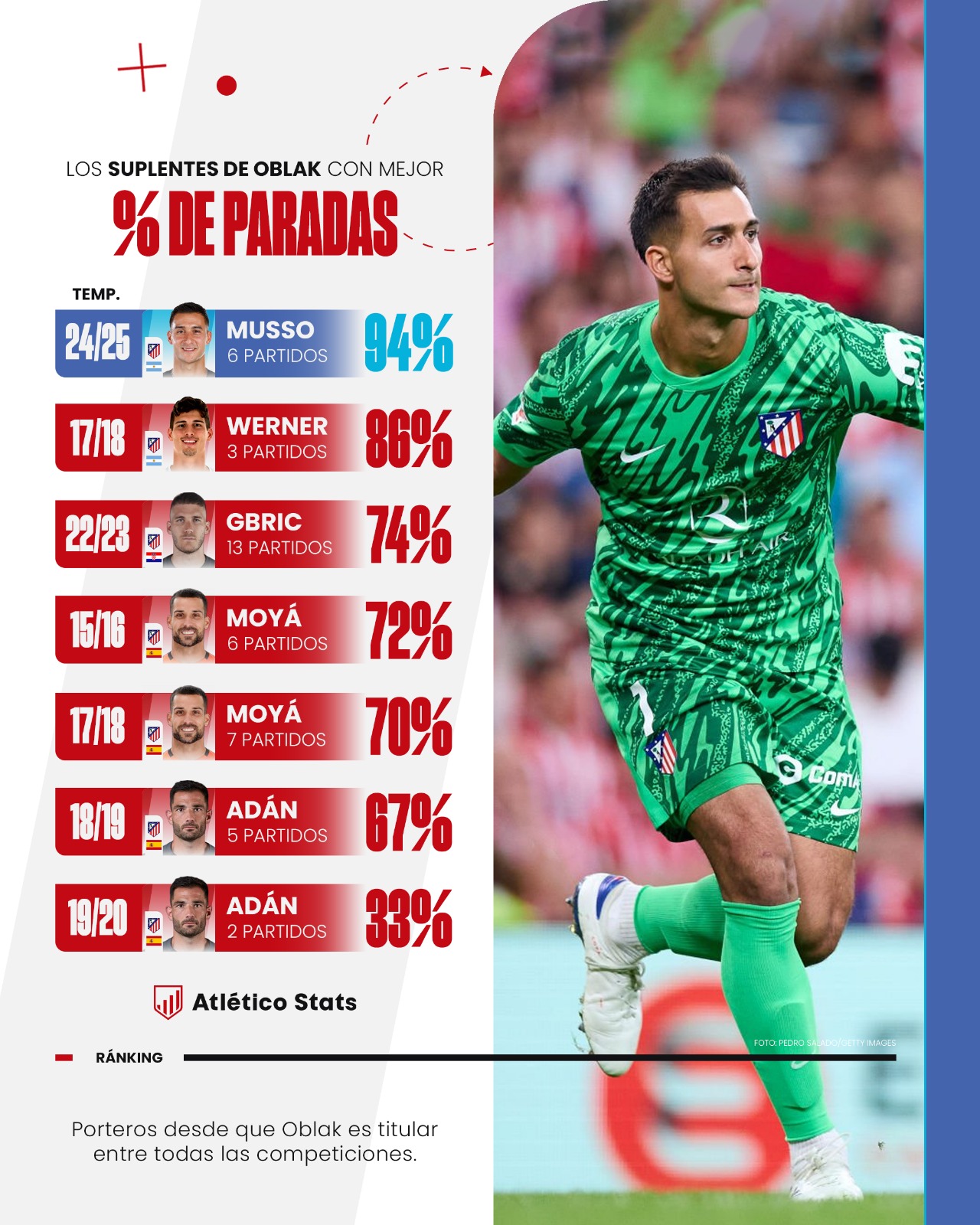 El guardameta argentino llegó como cedido al Atleti tras ganar, como titular, la Europa League 23-24 con el Atalanta. Pronto, en la jornada cuatro de La Liga, Musso tuvo que debutar por molestias de Oblak. Y lo hizo en San Mamés, uno de los campos más difíciles de visitar. El Atleti ganó (0-1) y el argentino, más allá de una parada clave y un buen juego de pies, dio en todo momento la sensación de transmitir seguridad.
