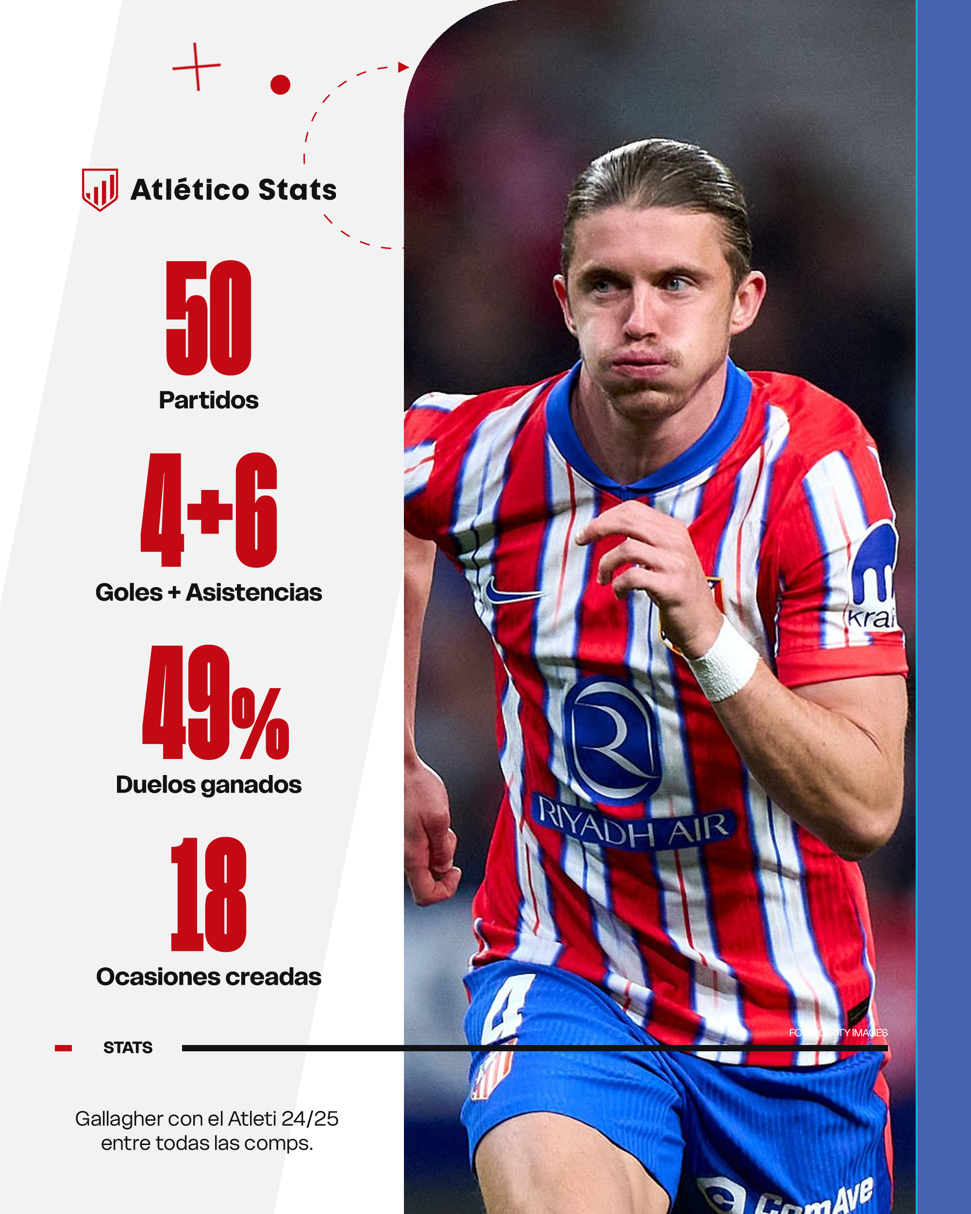 Pero Simeone se vio obligado a variar tácticamente al 1-4-4-2. Gallagher siguió contando, pero fue el sacrificado a nivel comodidad. Ha sido, la mayor parte de la temporada, un mediocentro por izquierda, pese a no tener —diría— ninguna virtud para jugar ahí, más allá de ser, en principio, una buena ayuda para el lateral izquierdo en fase defensiva.