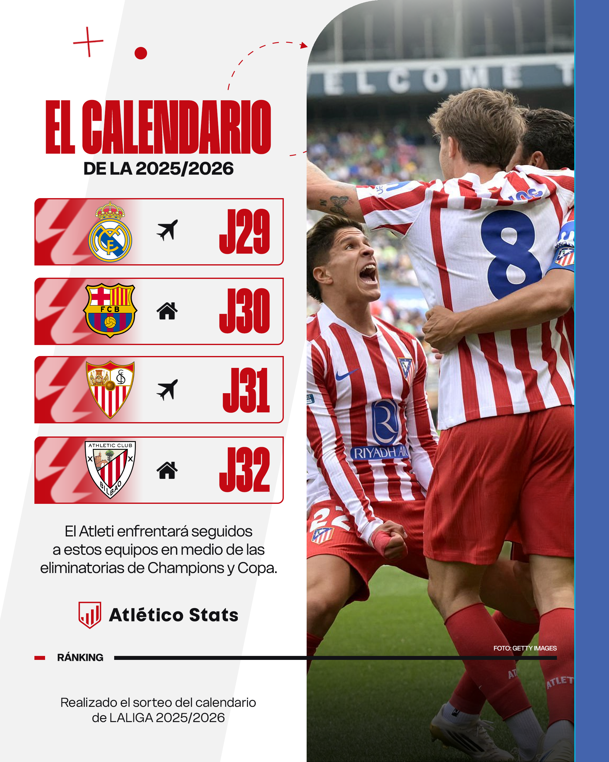 Casualidades del destino -o no-, lo cierto es que, a partir de la jornada 29, el Atlético comienza su particular lucha de titanes. Empieza con el Real Madrid de visitante, pero luego recibe al FC Barcelona, visita al Sevilla en la siguiente jornada y, posteriormente, acoge en el Metropolitano al Athletic Club. Por si fuera poco, se entiende que, entre medias de todos estos partidos, habrá eliminatorias de Champions y Copa del Rey.