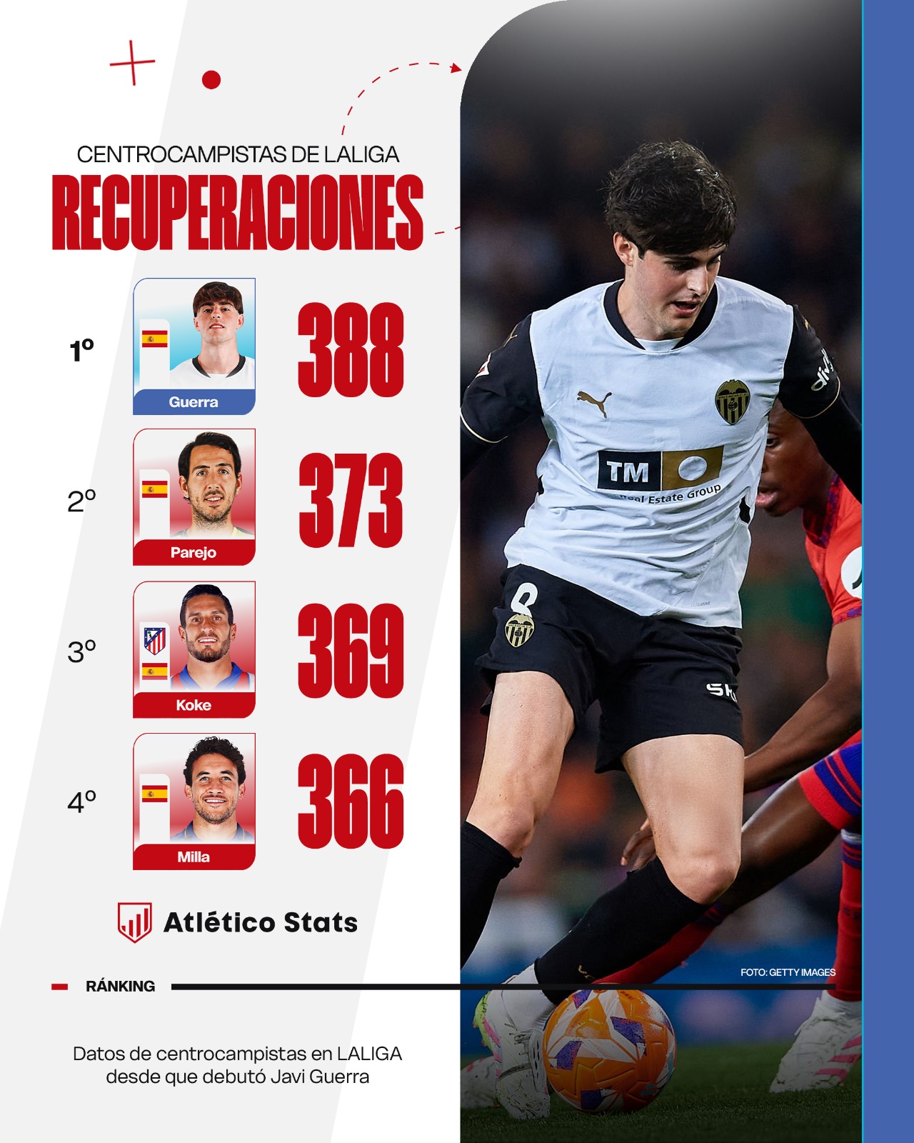 El nombre de Javi Guerra aparece y hay muchas dudas. No es el mismo perfil que De Paul, aunque sí ha jugado en el doble pivote junto a Barrenechea y recogiendo buenas cifras, sobre todo defensivas. ¿Sabíais que es el 1º en recuperaciones de centrocampistas de LaLiga desde que debutó?