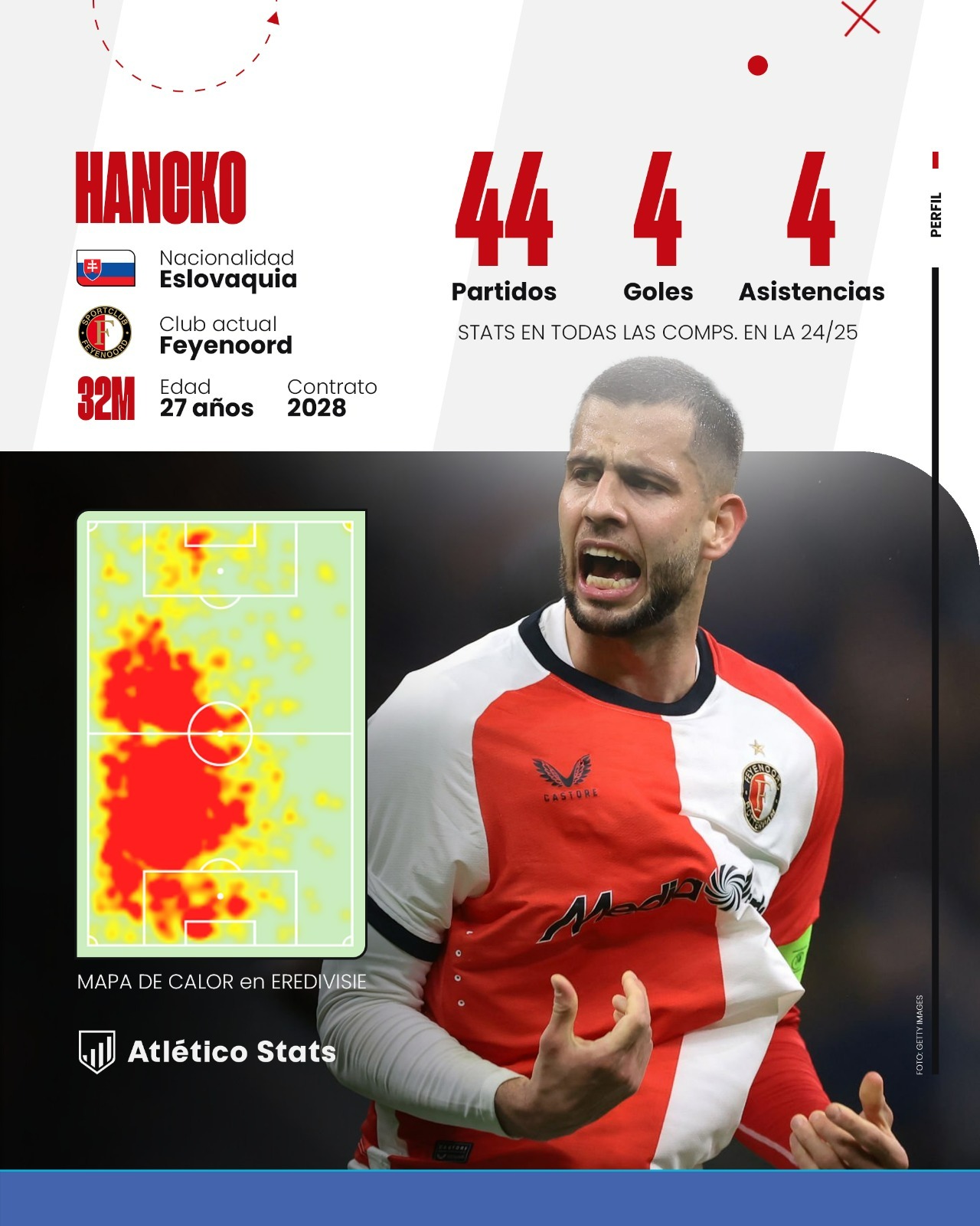 ASÍ JUEGA DAVID HANCKO Hancko es un perfil de defensor muy interesante , y encaja perfectamente con lo que, aparentemente, busca Simeone para el próximo Atleti: un jugador privilegiado en lo físico, alto (1,88), valiente para defender hacia adelante y con capacidad de corrección hacia atrás. En definitiva, un zaguero que gana duelos, que permite al equipo instalarse en campo rival , y que tiene las aptitudes físicas e intuitivas necesarias para resolver situaciones que requieren reacción inmediata. Además, su polivalencia defensiva le permitirá a Simeone usarlo como central o lateral en una línea clásica, o como central exterior en un sistema de tres centrales.