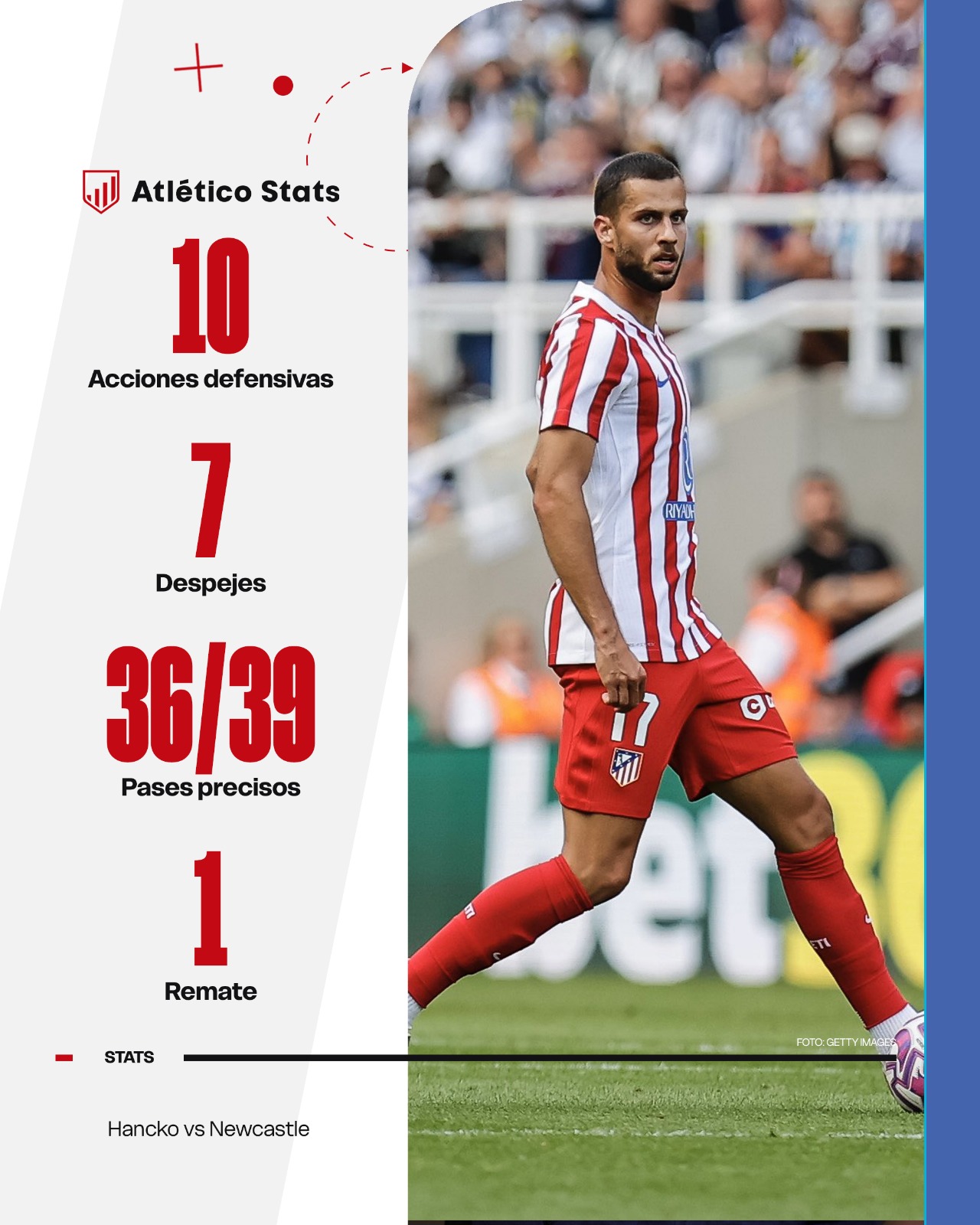 En varias jugadas donde la transición del Newcastle llevaba ventaja ante el repliegue del Atleti, sus acciones defensivas fueron brillantes: bien perfilado para hacer dudar al jugador que dividía con la conducción. No se sabía si iba a entrar al poseedor o a saltar al receptor. Esa incertidumbre resta sorpresa al rival y permite a sus compañeros culminar el repliegue.