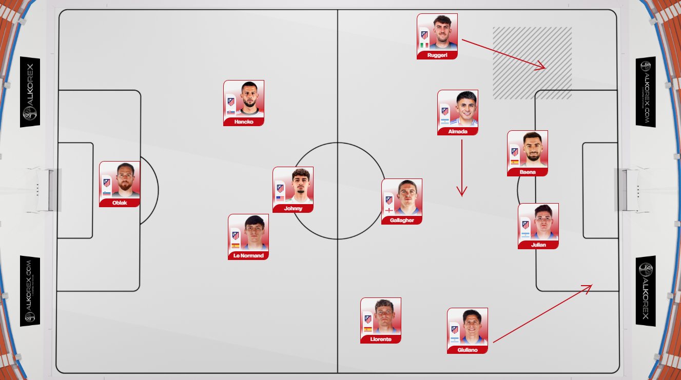Mención especial merece Almada. Se ha ido De Paul, y su sustituto —ya sea Barrios o Gallagher— es un perfil diferente, más enfocado en la explosividad hacia campo rival que en la creatividad. Almada, en cambio, sí ofrece creatividad, aunque por su posición tenga que venir a pedir el balón desde zonas más bajas. En el fútbol actual, siempre digo que no importan tanto las posiciones, sino los roles. Y si tienes a un "mediocentro creativo" actuando como mediapunta o falso extremo izquierdo, perfecto.
