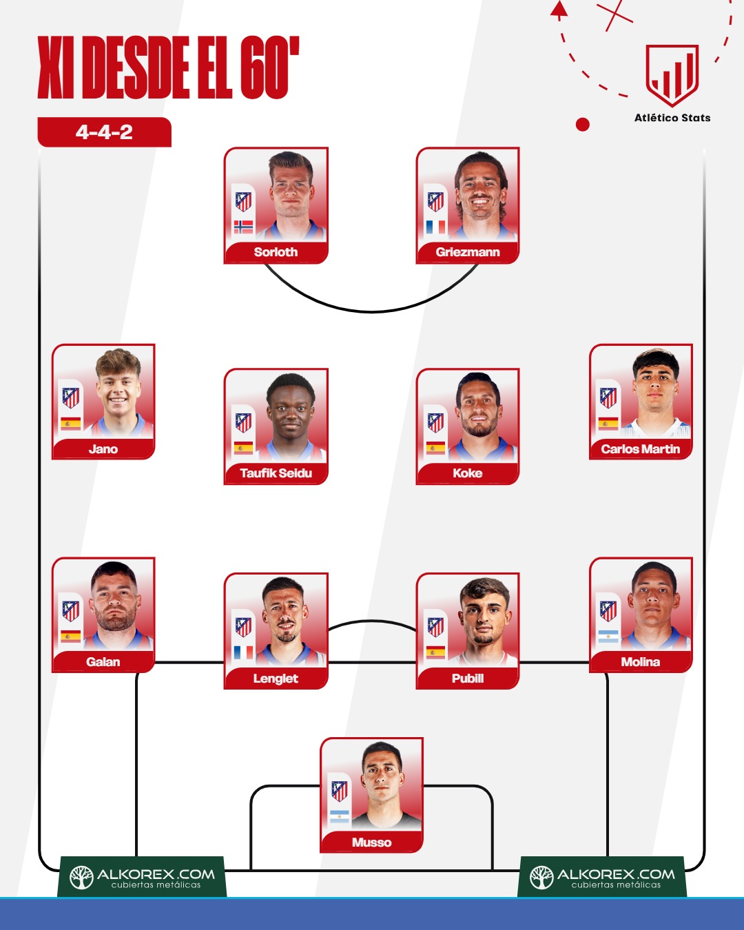 Venían de disputar 60 minutos en el ‘amistoso secreto’ contra el Rayo Vallecano. Hoy les tocaba jugar media hora, y el rendimiento fue de notable alto. Sørloth y Griezmann, que conectaron de forma excelente en el segundo gol, se beneficiaron de las múltiples ocasiones en que el Atleti pudo transitar, asociándose bien entre ellos y permitiendo al equipo desplegarse con peligro. ¿Preparándose para ser “la pareja de revulsivos”? Ambos se complementan muy bien. Si Griezmann sigue mejorando sensaciones, es posible que el Atleti cuente con una delantera prácticamente inmejorable para los minutos decisivos de muchas segundas partes.