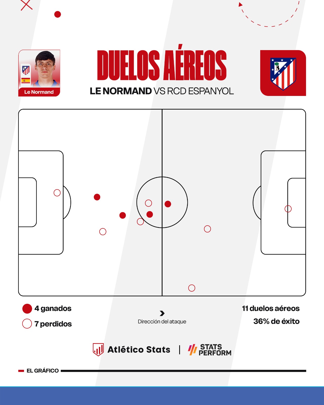 Su número de duelos aéreos perdidos en Cornellà lo dice todo. Su tercer peor registro en un mismo partido en toda su carrera en LaLiga y, además, se lleva el dudoso honor de ser el top-1 de la primera jornada en cuanto a más disputas aéreas perdidas (7). Porque se lo comió Kike García, que podría ser lógico, pero es que también lo hice Pere Milla que ni llega a los 180 centímetros.
