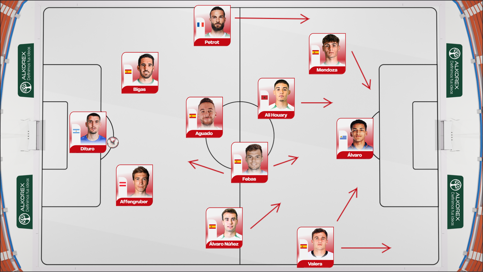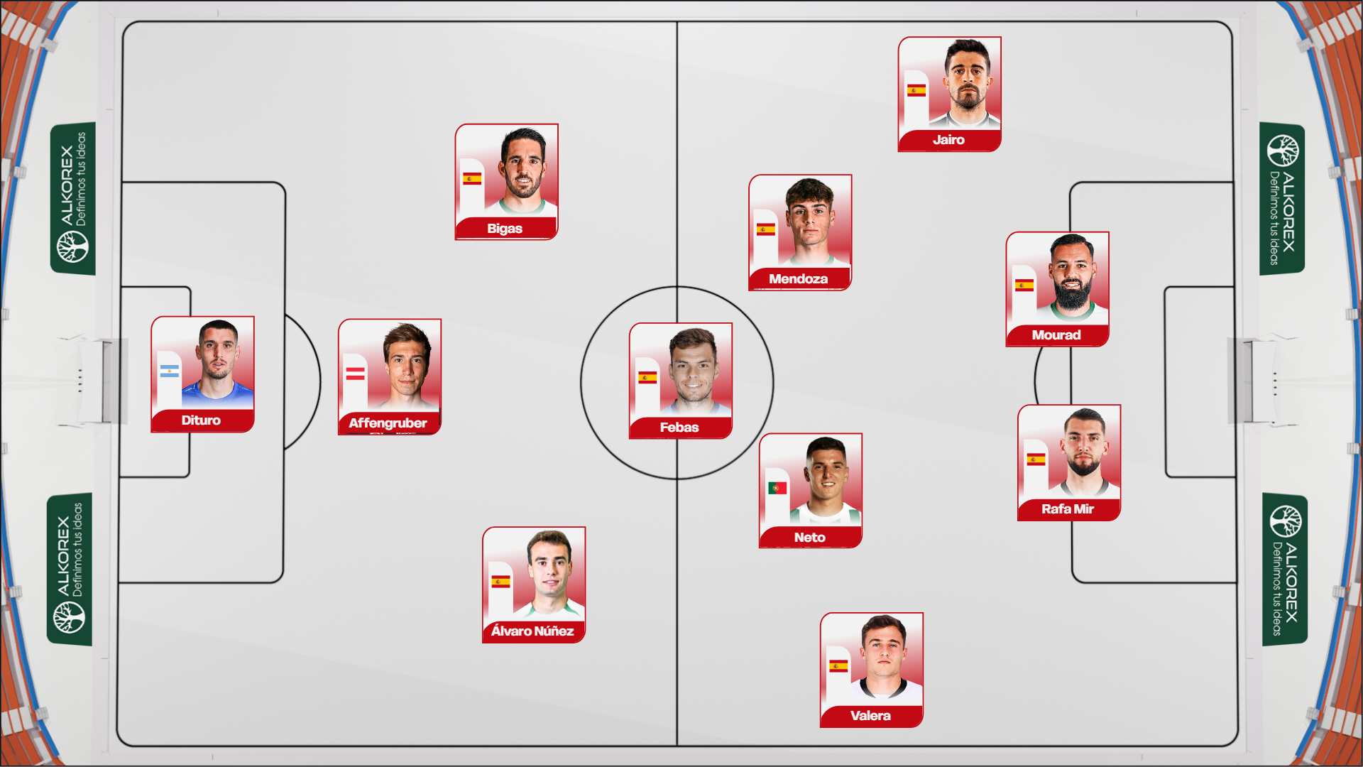Este 1-3-5-2, muy alto sobre el campo del Betis, inclinó el tablero muy a favor del Elche. Los centrales exteriores fueron agresivos desde sus carriles, Febas y Martim Neto movieron el balón de lado a lado con habilidad, dinamismo y verticalidad, Jairo y principalmente Germán Valera generaron desde fuera, tanto desde el centro como desde el regate, y Rafa Mir y Mourad fijaron bien a los centrales del Betis, que previamente se estaban imponiendo con facilidad a Álvaro.