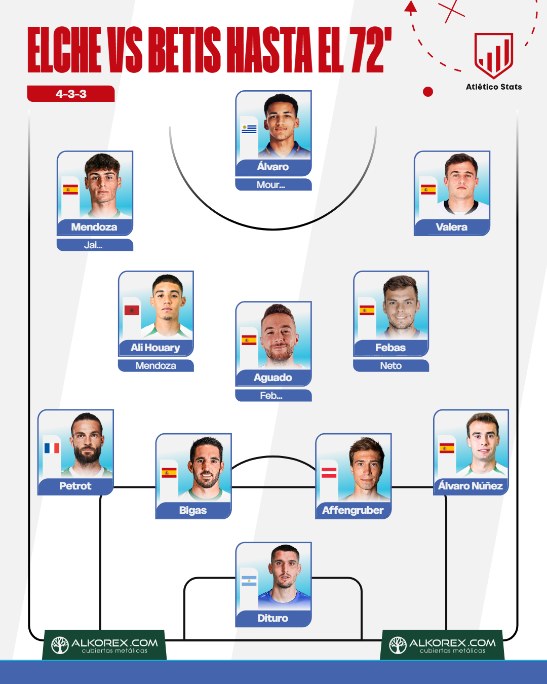 Además, Eder Sarabia ya dejó muestras de dominio en la intervención, siendo decisivo para ese primer punto que consiguió el Elche. Hasta el minuto 72 jugó con el XI que acabamos de enseñar, más allá de que en el minuto 65 acertara con los cambios de Martim Neto y Jairo, perfiles que hicieron la estructura más ofensiva.