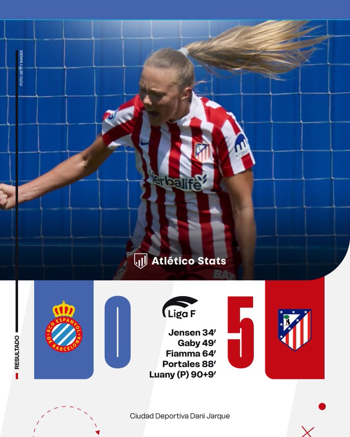 El Atlético Femenino ha estrenado el nuevo curso liguero en la Liga F Moeve con una contundente victoria en la Ciudad Deportiva Dani Jarque (0-5) que espanta los fantasmas de una pretemporada que dejó alguna duda que otra por los resultados y las sensaciones, pasando por encima de un Espanyol al que endosó una 'manita' con los goles de Jensen, Gaby García, Fiamma, Maca Portales y Luany, que cerró el marcador desde el punto de penalti en el tiempo de descuento.