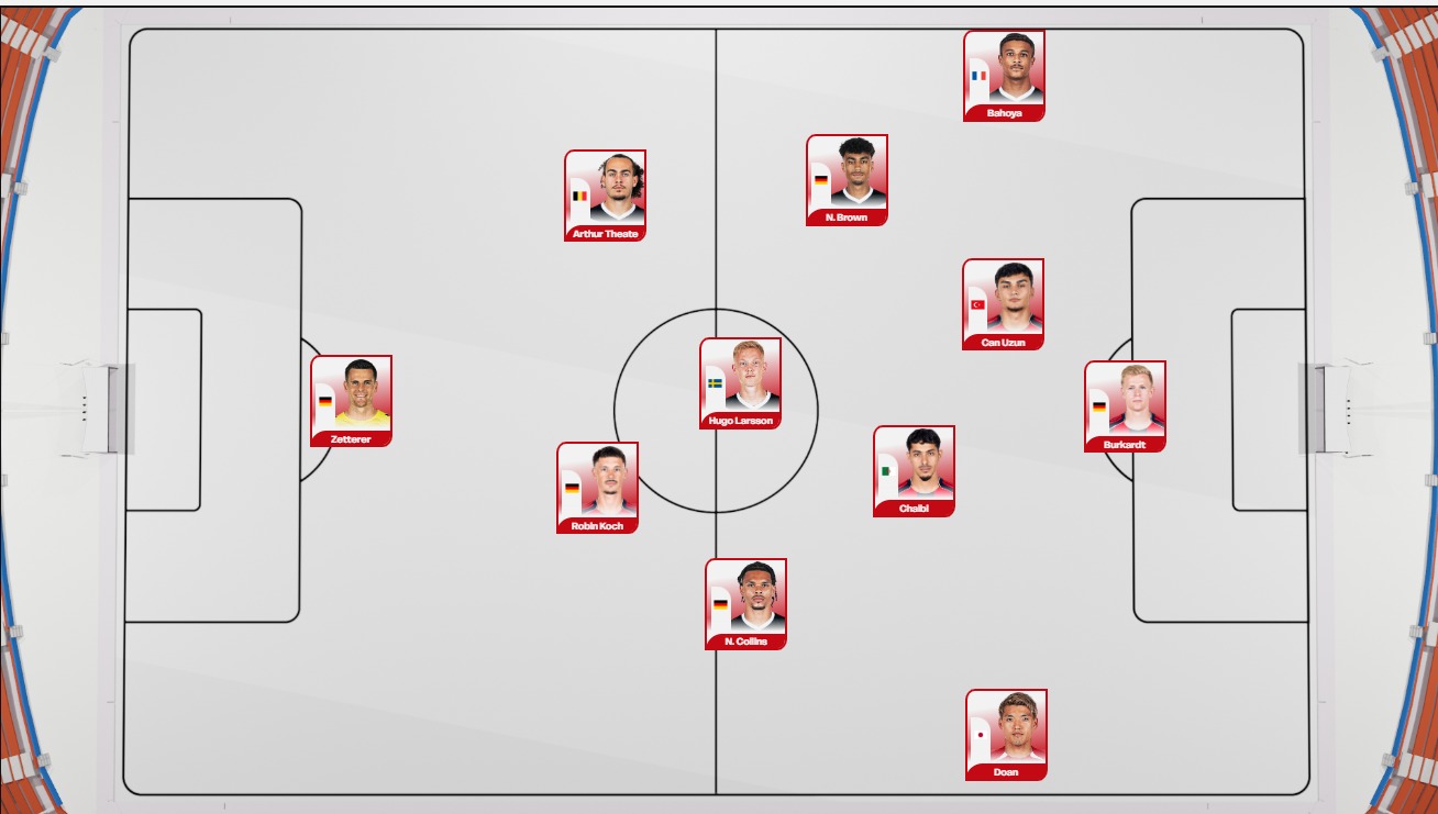 un estilo vistoso, propositivo y muy ofensivo En la salida de balón intentan atraer al máximo para poder tener ventajas en la posterior transición ofensiva, en alguna ocasión arriesgan mucho desde atrás, lo que le generan pérdidas peligrosas . El lateral derecho, Collins en este caso, suele interiorizar su posición y puede o bien unirse a la salida con portero + centrales, o ubicarse en zonas de mediocampo para compensar que el MC –Chaibi- gana altura para integrarse en tres cuartos con Uzun, la joven joya turca de 19 años. En la fase de construcción, ese juego interior de los laterales, ya que el lateral izquierdo puede dar apoyo en campo contrario, y la altura que acaban cogiendo los centrales cuando el equipo está plantado en campo contrario, hacen al Eintracht un equipo capaz de mantener durante muchos tramos su ataque posicional , porque siempre tiene opciones ubicadas en posición ofensiva por detrás de línea de balón. Clave Hugo Larsson como constante nexo entre alturas.