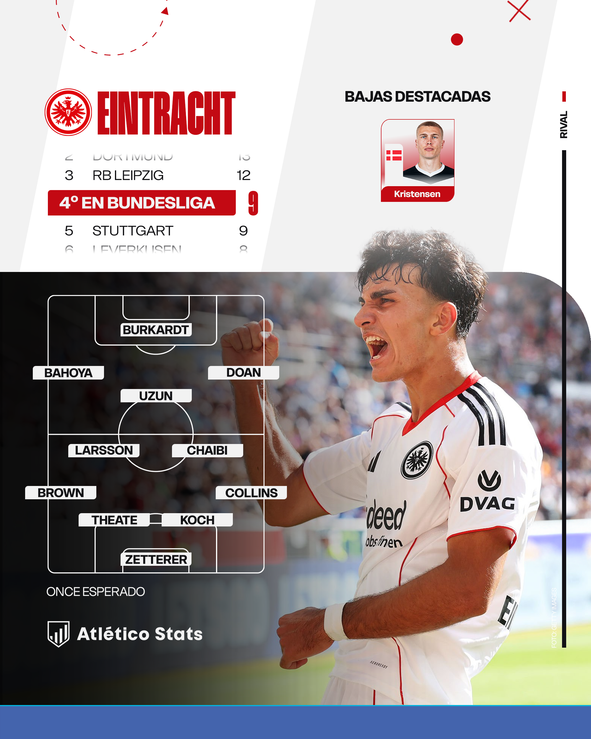 el resumen El Eintracht Frankfurt es un rival al que respetar en todo momento: puede sorprender, dominar fases del encuentro y generar peligro constante. Sin embargo, su apuesta ofensiva tan marcada suele dejar grietas atrás. Se espera un partido de ida y vuelta, similar al derbi reciente. El Atleti deberá mostrar su mejor versión, pero por estilo, este rival puede resultarle “cómodo”: presiona alto, arriesga en salida y concede muchas oportunidades para robar en campo contrario, justo lo que busca el equipo rojiblanco en esta etapa.