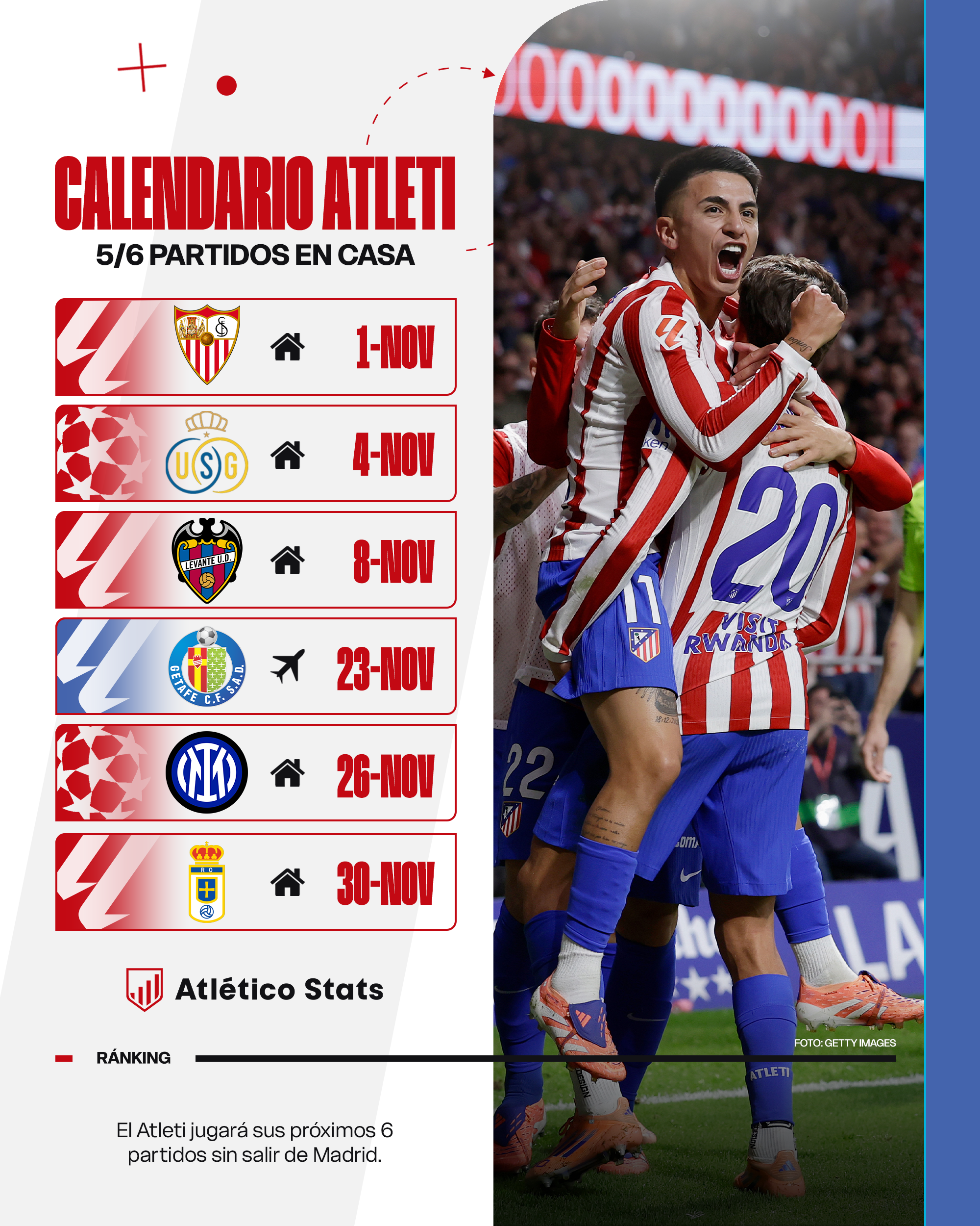 De los próximos seis partidos oficiales, cinco serán en el Metropolitano y el otro será sin salir de la Comunidad de Madrid Los colchoneros han ganado en el Metropolitano sus cuatro últimos duelos en LaLiga (Villarreal, Rayo Vallecano, Real Madrid y Osasuna), no pierde como local desde marzo (8V 1E) y solo dos equipos han conseguido ganarle en San Blas-Canillejas en los tres últimos años : Barcelona (en enero de 2023, marzo de 2024 y marzo de 2025) y Osasuna (mayo de 2024).