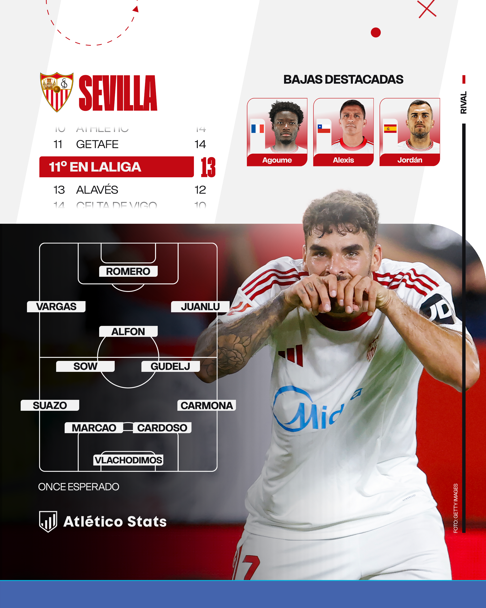Como apunte estadístico, solo ante el Athletic Club y el Valencia (14) se ha enfrentado más veces como local Diego Pablo Simeone como técnico del Atlético de Madrid sin perder en LaLiga que frente al Sevilla (13, las mismas que contra Getafe y Celta de Vigo).