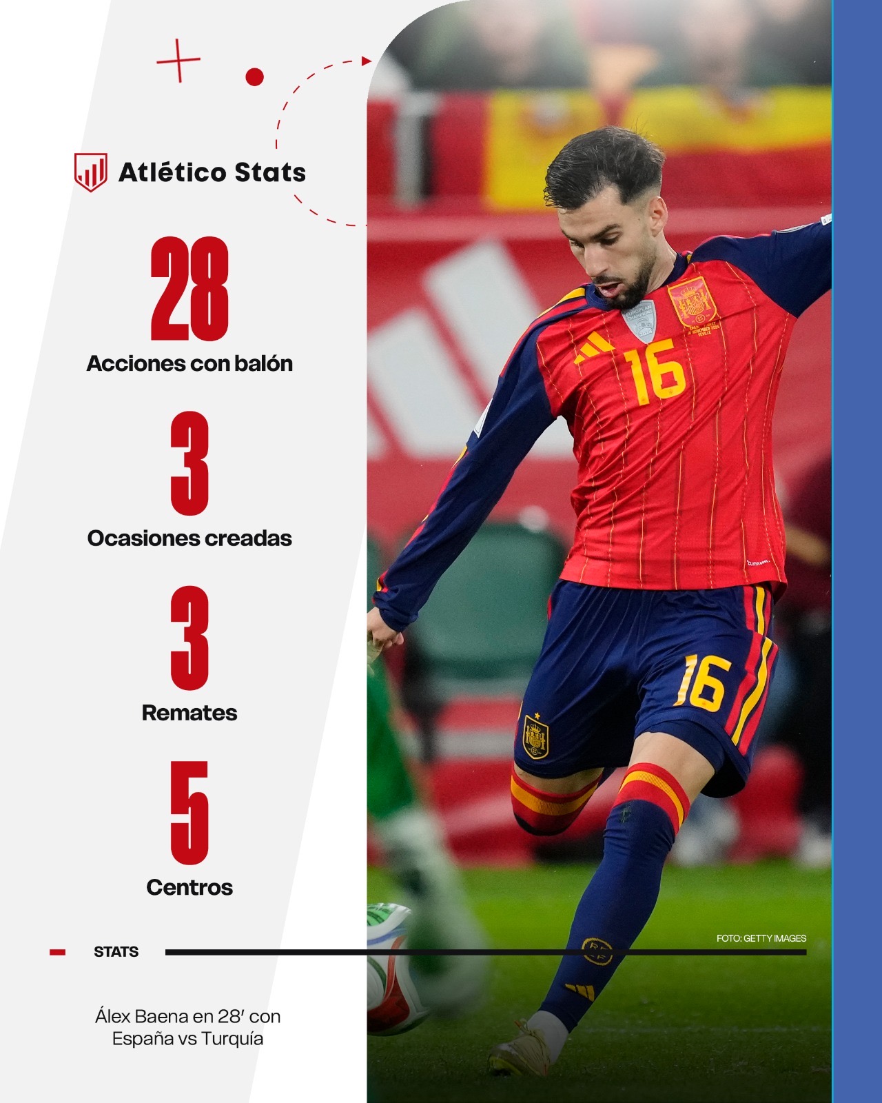 Certificado el billete para disputar el Campeonato del Mundo de 2026 que se disputará en Estados Unidos, Canadá y México y en plena recta final para formar parte de la nómina de 26 jugadores que cite Luis de la Fuente para buscar la segunda ‘estrella’ de la historia, Álex Baena ha demostrado galones, cualidades y recursos para jugar su primera cita mundialista como internacional absoluto, jugando 209 de los 360 minutos totales (58%) entre los partidos de Georgia (27'), Bulgaria (63'), Georgia (90') y Turquía (29').