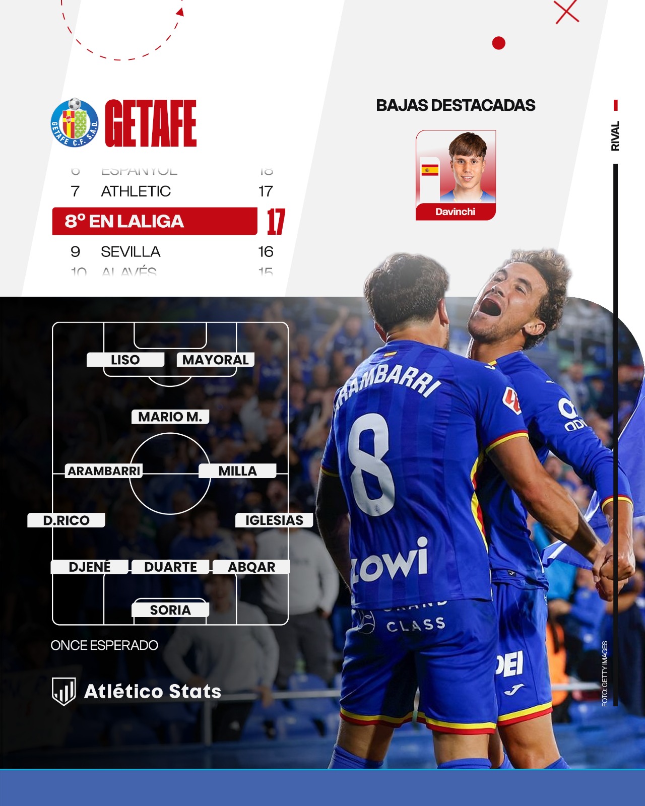 Al Coliseum llega el Atleti con la cautela que merece un rival al que solo un equipo le ha ganado esta temporada en el sur de la capital , puntuando en cuatro de los cinco encuentros como local este curso (ocho puntos de 15 posibles) después de perder los cinco últimos disputados en casa de la campaña 2024/25. Es, también, un examen, una cuenta personal para el equipo rojiblanco. Su última visita al Coliseum fue una cita con el dentista (derrota por 2-1 en el mes de marzo), tirando al traste una racha de 24 partidos ligueros sin derrota (4E 20D), la secuencia invicta más larga ante un mismo rival en la máxima categoría.