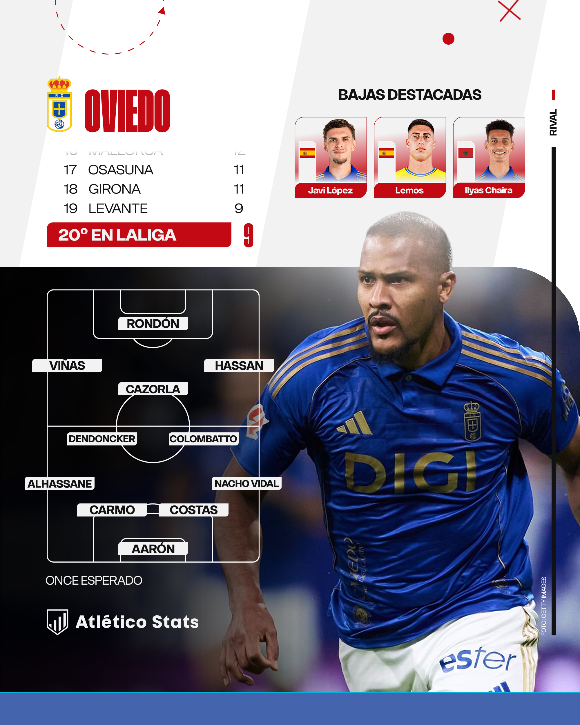 En descenso Con nueve puntos de 39 posibles, siendo el colista de LaLiga, el Real Oviedo se presenta al Metropolitano con la luz de emergencia encendida. Ha pasado poco más de un mes desde que Jesús Martínez, dueño del Grupo Pachuca y máximo accionista de la entidad ovetense, equivocase el mensaje sobre las aspiraciones de un equipo recién ascendido que precisamente no ha sabido moverse bien en el mercado de fichajes, fiando todo a incorporar jugadores veteranos. " No pienso en no descender, sino en algo más grande . Tenemos que pensar diferente. Háblame de que estamos peleando copas europeas , no que estamos fuera del descenso por goles”, llegó a formular tras el despido de Veljko Paunovic.