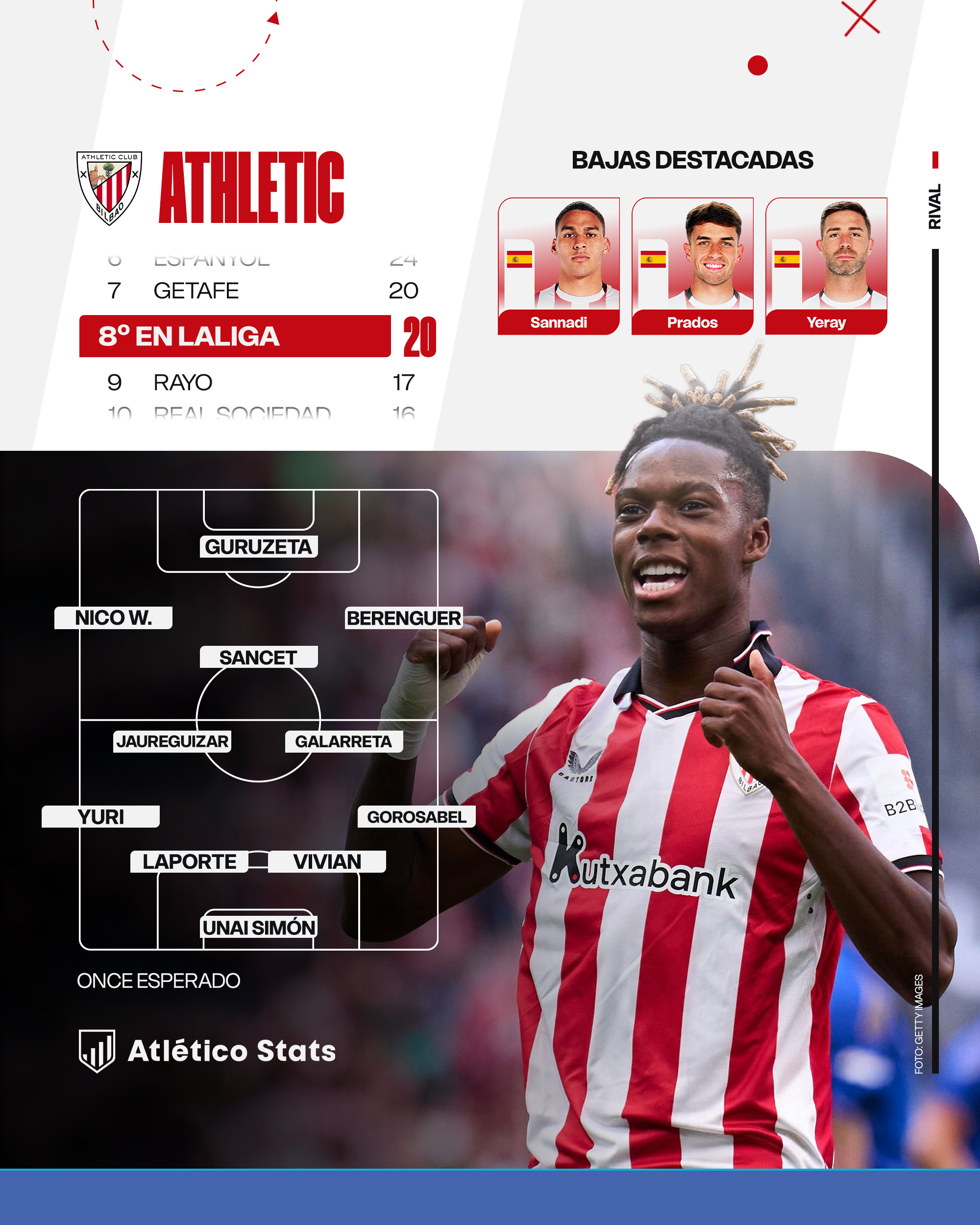 El que también necesita recuperarse de forma urgente es un Athletic Club que ha perdido en cuatro de las seis últimas jornadas ligueras, siendo arrasado por Barcelona (4-0) y Real Madrid (0-3) en los últimos encuentros. La temporada más ilusionante desde hace tiempo, la que arrancaba con el pulso ganado al Barcelona por la renovación de Nico Williams y el regreso a la Champions League una década después desde su última participación como principales factores, no está siendo tal y como se esperaba. El paso por Europa y el bajo nivel ofrecido por los jugadores más diferenciales está pasando factura en LaLiga, situándose muy lejos de la Liga de Campeones y con desventaja en la pelea por plazas europeas.