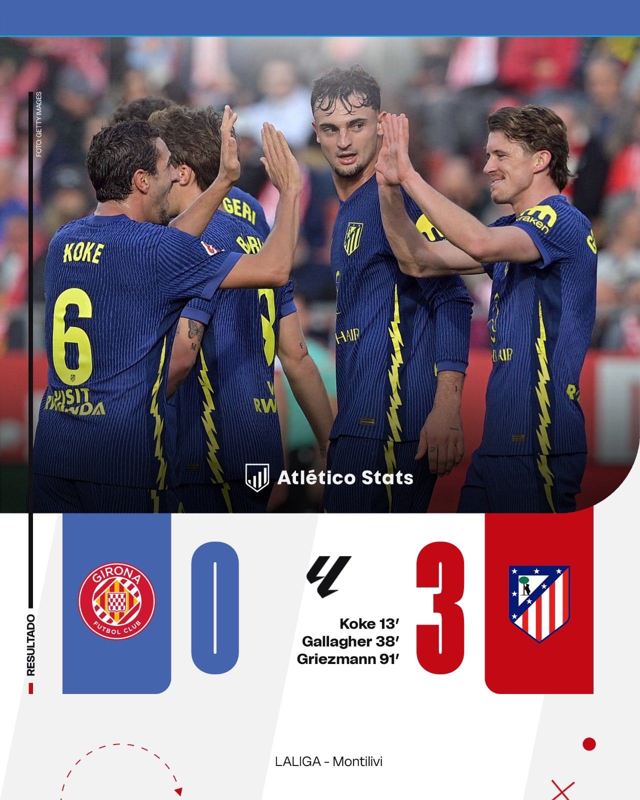 Jorge Resurrección , que ya había abierto el marcador en el último compromiso liguero ante el Valencia, volvió a hacer el primer gol del partido con un disparo desde fuera del área inmejorablemente estético y efectivo. El partido de Koke es una muestra perfecta de que juega a un fútbol que pocos mediocentros pueden jugar de manera tan brillante en lecturas y ejecución ; si en el primer tiempo fue el jugador que ponía en disposición al equipo para poder transitar con ventaja, en el segundo tiempo fue el nexo de todos para combinar y desconectar, con posesiones defensivas e inteligentes, el impulso de remontada del Girona.