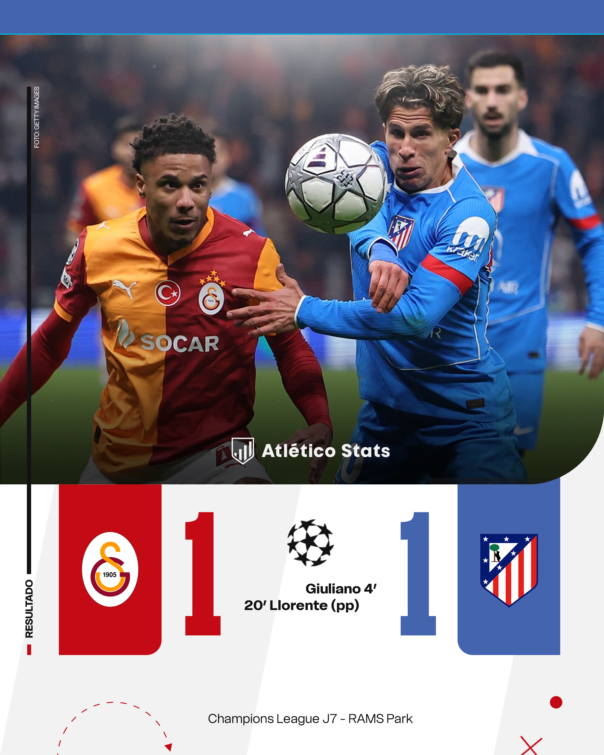 DE UN MUY BUEN INICIO AL HABITUAL TIRO EN EL PIE Porque el inicio fue totalmente inmejorable , como escribir en un folio en blanco el inicio de tu película ideal. El Atleti dejó en nada el supuesto infierno turco inicial con una gran personalidad ante la presión alta del Galatasaray, atreviéndose a sumar pases en salida de balón, viajando junto al campo contrario y plantándose allí. La acción del gol, donde participan Oblak, Pubill, Koke, Llorente, Barrios, Julián, Almada, Ruggeri y Giuliano, fue la demostración perfecta de un imponente inicio.