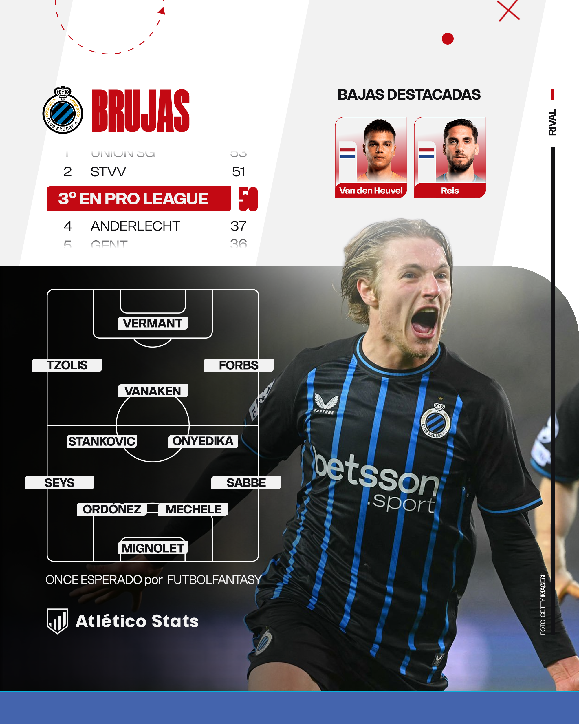 El escollo que necesita superar para medirse en octavos de final a Tottenham Hotspur o Liverpool es un Brujas que participa en los play-offs eliminatorios de la Champions League por segunda temporada consecutiva. El cuadro 'blauw-zwart', que en la vigente edición del curso europeo ha puesto contra las cuerdas a rivales como el Barcelona (3-3 en el Jan Breydelstadion) y al que le ha bastado con sumar seis puntos de los últimos seis posibles para colarse entre los 24 primeros clasificados, llega reforzado tras ganar el derbi al Círculo de Brujas en la última jornada de la Jupiler Pro League, intensificando su persecución al Union Saint-Gilloise por el liderato. Con cuatro tantos y otras tantas asistencias, Hans Vanaken, que combina talento con veteranía, es el jugador más prolífico del equipo belga en la presente participación europea.