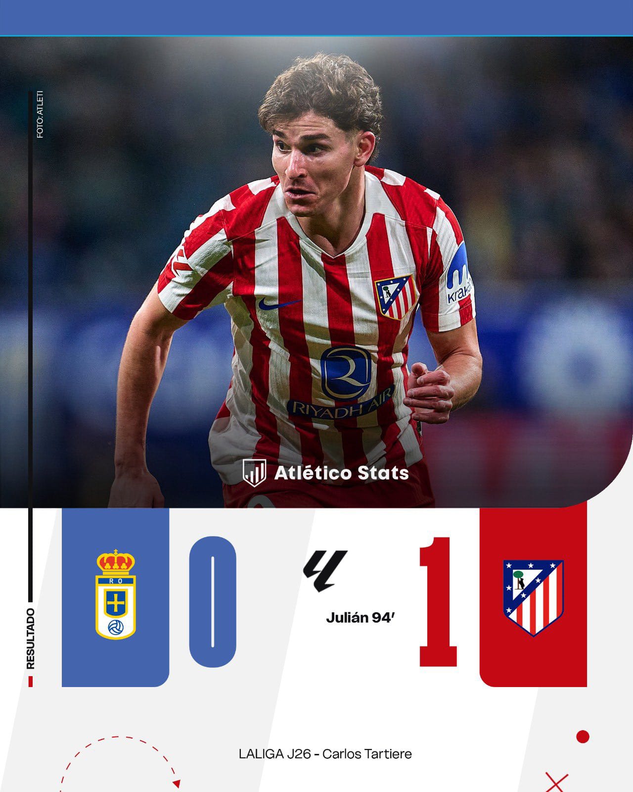 JULIO DÍAZ Y UNA FOTO SOÑADA Sin lugar a dudas, la mejor noticia del partido. El lateral izquierdo del Madrileño de Fernando Torres debutaba con el primer equipo , haciéndolo directamente en el once titular . Y precisamente lo mejor que se puede decir de su actuación es que en ningún momento pareció un canterano . Hemos repetido muchas veces en Atlético Stats que los jugadores que destacan por su talento innato pueden tener hasta más fácil demostrarlo en Primera División que en Primera Federación. Julio estuvo cómodo y preciso en el circuito asociativo, cumplió en fase defensiva pese a que tenía un examen difícil ante Hassan y las subidas de Nacho Vidal, y físicamente ya no es que no restase, es que acabó con más piernas que la mayoría de los jugadores que jugaron todo el encuentro; y, por supuesto, acabó siendo clave en el gol de Julián , con ese “nunca dejes de creer” en modo de tackle para evitar que el balón saliese de banda. Una foto que, a buen seguro, ya está colgada en modo de cuadro en la casa de nuestro querido Julio.