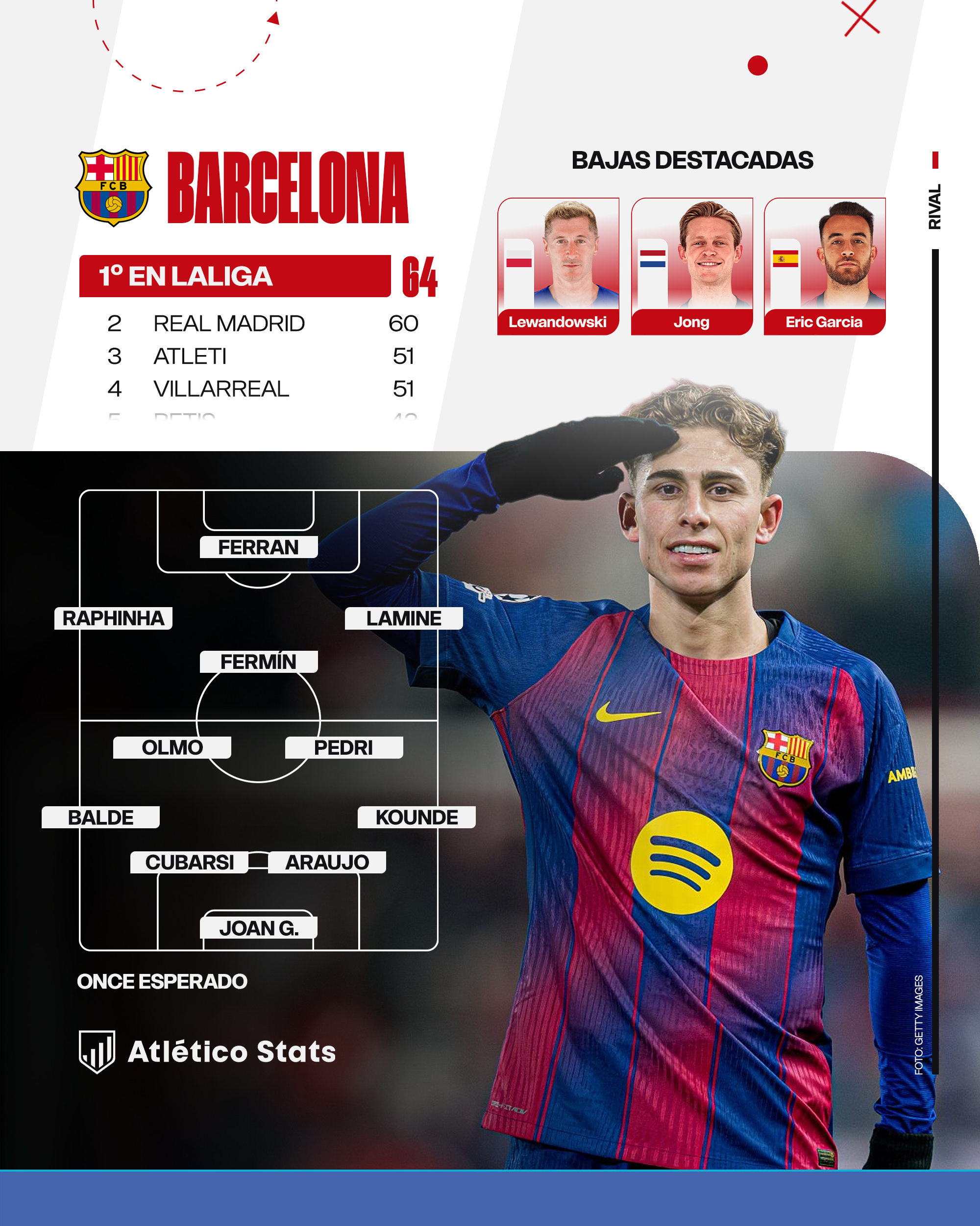 Sin Frenkie de Jong por lesión ni Eric García por sanción, Flick, recientemente centenario con la entidad azulgrana, nivelará el eje de los centrales con Ronald Araujo o Gerard Martin y tapará el agujero en el medio con la que será la primera titularidad de Pedri González desde que se ha recuperado la lesión tras coger ritmo competitivo frente a Levante y Villarreal. El que afila cuchillos es Lamine Yamal, que desde mediados de enero ha generado goles o asistencias en nueve de los once encuentros que ha disputado. Solo el Atleti y el Girona han podido frenar en este periodo al talento de Rocafonda, que viene de exhibirse en la última jornada liguera con un triplete.