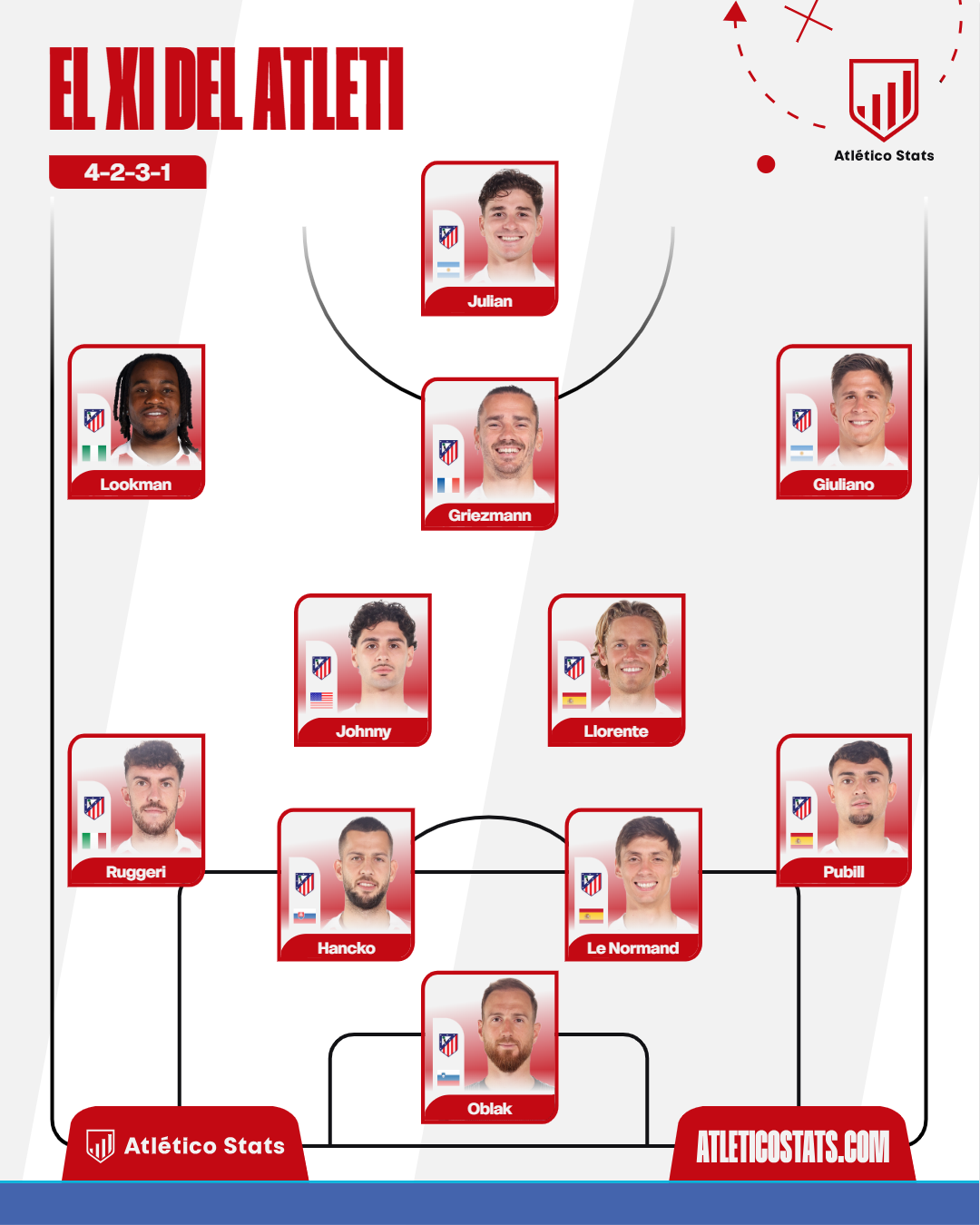 Se confirmaba la sorpresa que se intuía el día anterior al partido, con la entrada de Le Normand y, por ende, llevar a Pubill a esa posición de lateral derecho / central exterior, ya que Llorente iba al medio; Lookman era el elegido por delante de Sorloth en ese puesto de ataque que se están disputando. El resto era lo esperado, incluido un Johnny Cardoso que llega al momento decisivo de la temporada en un estado físico pletórico y en un esperanzador momento de confianza que, indudablemente, se traduce de forma evidente en su juego.