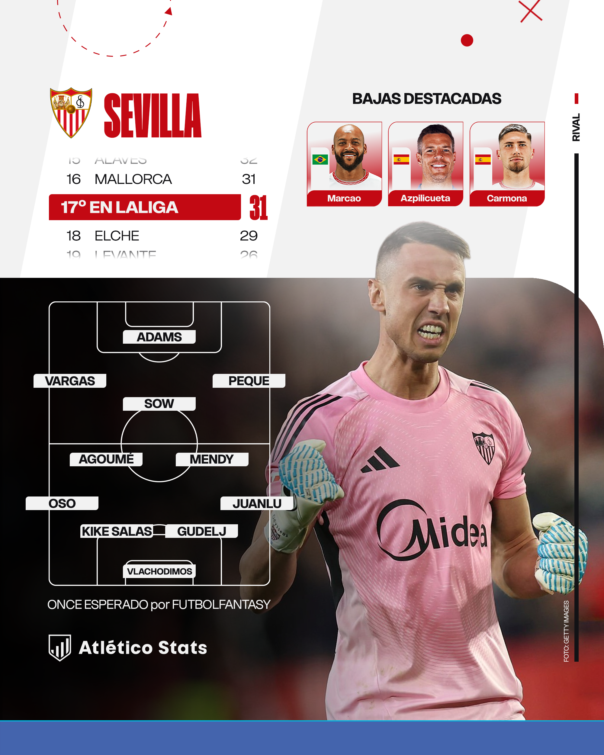 Necesita reconstruir de forma urgente Luis García Plaza una estructura que pierde equilibrio cada semana que pasa. Para el duelo ante el Atlético de Madrid tendrá que improvisar la defensa, la línea que más agua hace hasta el punto de distinguirse por ser el equipo de LaLiga que más goles ha recibido a estas alturas del campeonato doméstico (50, los mismos que el Levante). El técnico madrileño no puede contar con Marcao a causa de una fractura de escafoides, tiene la duda de César Azpilicueta por unas molestias que arrastra desde hace meses y que le impiden tener continuidad y ha perdido a José Ángel Carmona y a Tanguay Nianzou por sanción. Ni siquiera el Sánchez Pizjuán suaviza el trance, siendo el segundo peor local de LaLiga (16 puntos de 45 posibles, dos más que el Levante).
