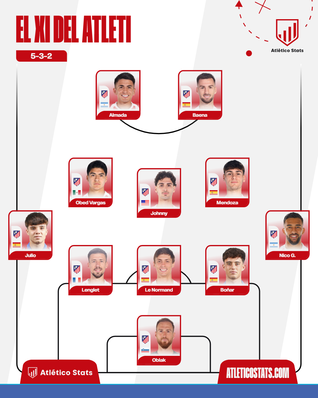 Ajustó Simeone al descanso con la entrada de Pubill y Nahuel por Le Normand y Julio —con amarilla, pero volviendo a demostrar un nivel bastante óptimo—. El argentino fue carrilero derecho y Nico, en una decisión bastante difícil de comprender de Simeone, pasó al carril izquierdo pese a estar siendo tremendamente diferencial en banda derecha. Intentó resistir el Atleti en 1-5-3-1 , pero evidentemente iba a costar tener situaciones ofensivas, incluso pese a que posteriormente entraron Barrios —evidenciando falta de ritmo y de sensaciones , amén de una evidente precaución en sus acciones—, Giuliano y Griezmann .