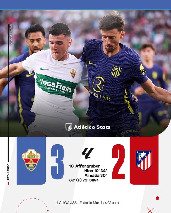 Como tremendamente decepcionante , valga la redundancia, es el gol final que dio una victoria merecida al Elche. El Atleti volvió a encajar otro gol en segunda jugada tras una acción a balón parado . Venir de perder una final por falta de activación, concentración y entendimiento de este tipo de jugadas, y encajar dos goles así a los cuatro días, habla tremendamente mal de la actitud —y de las aptitudes en muchos de ellos— de los jugadores y/o de cómo está trabajando el cuerpo técnico estas acciones. El Atleti lleva toda la temporada encajando este tipo de goles y recibe al Arsenal, un equipo histórico aprovechando este tipo de dudas en los rivales. Padre nuestro que estás en los cielos, santificado sea tu nombre...