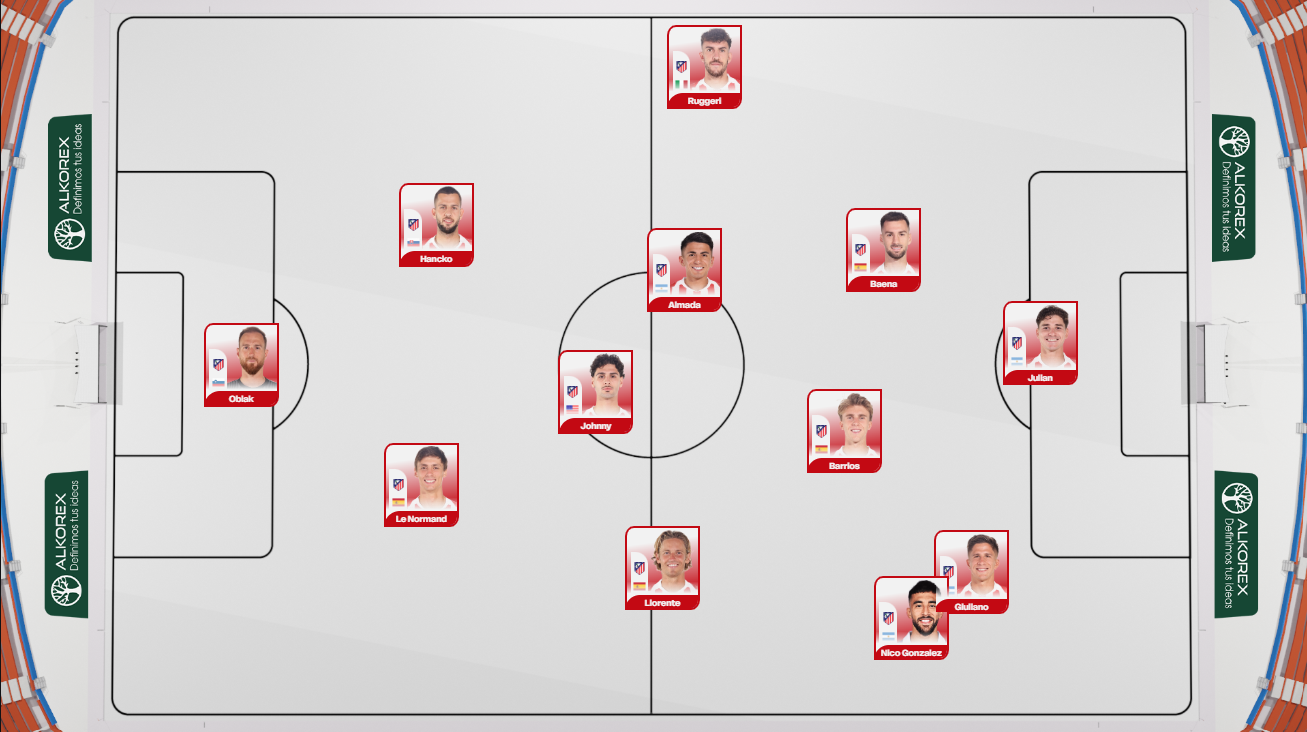 En la pizarra vemos la tendencia ofensiva hacia la que está yendo el Atlético de Madrid. La banda izquierda debe ser toda para Ruggeri, ya que el teórico extremo izquierdo, Almada, es quien, viniendo a recibir, asume el rol y las funciones de mediocentro organizador. Eso genera la posibilidad de que el mediocentro en fase defensiva, en este caso Barrios, pueda alcanzar una altura más adelantada para estar conectado al campo contrario, donde, por su energía, calidad y despliegue físico, es bastante más útil y diferencial que en campo propio. Baena, con un rol menos intervencionista que en el Villarreal, debería traducir su participación en apariciones más definitivas, que le permitan estar siempre cerca del gol o de la asistencia a Julián.